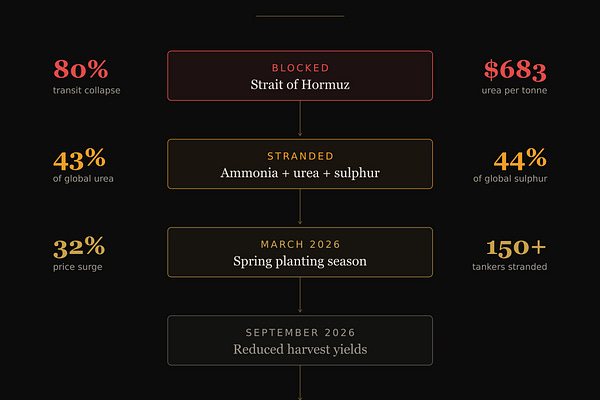 The war on Iran closed Hormuz. The oil shock made headlines. The fertiliser shock did not. By September, your grocery bill will explain why.