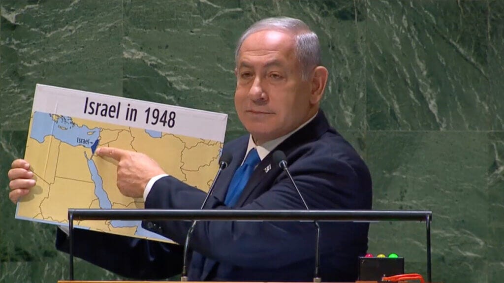 Most people think the idea of the land bridge is a result of this war. It is not. It is actually part of the India-Middle East-Europe Economic Corridors (IMEC), which were announced last year by the U.S. and its allies during the G20 meeting in September. The IMEC are planned economic corridors that aim to bolster the partners’ economic development by fostering connectivity and economic integration through railways, clean energy, and data pipelines among Asia, the Persian Gulf, and Europe. Specifically, it is supposed to connect Greece to India through a land bridge that crosses the UAE, Saudi Arabia, Jordan, and Israel, with the ports of Dubai and Haifa operating as maritime shipping hubs. The vision for IMEC was used by Israeli PM Benjamin Netanyahu during his speech at the UN in September 2023, which he represented visually as the map of “a new Middle East” from which Palestine would be erased.
